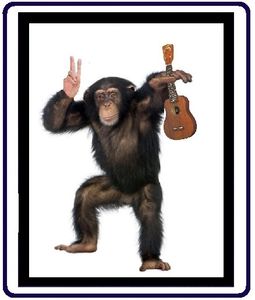 The "Ukulele Monkey" is flashing a peace sign. Attend a show and maybe you'll win a ukulele. The UKULELE MOONSHINERS have awarded Kala Ukulele's to contest winners at some of their shows.